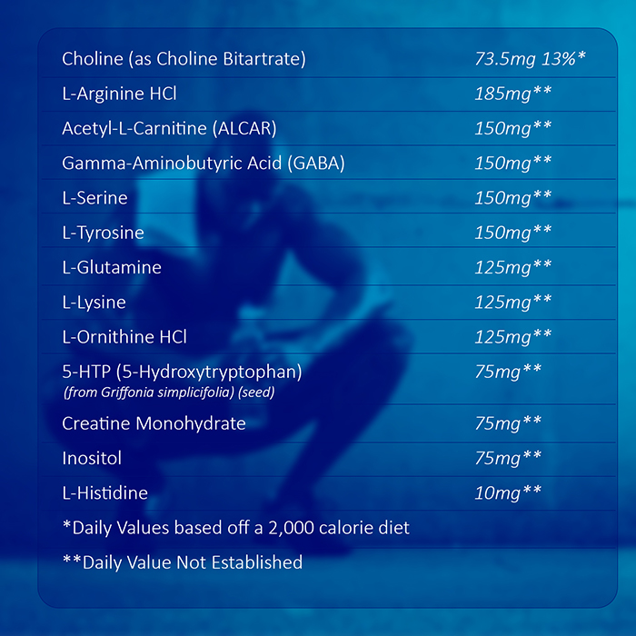 PROPRIETARY FORMULA - Consisting of a blend of amino acids, nutrients, and botanicals that work in concert to increase and restore balance in the nervous system.